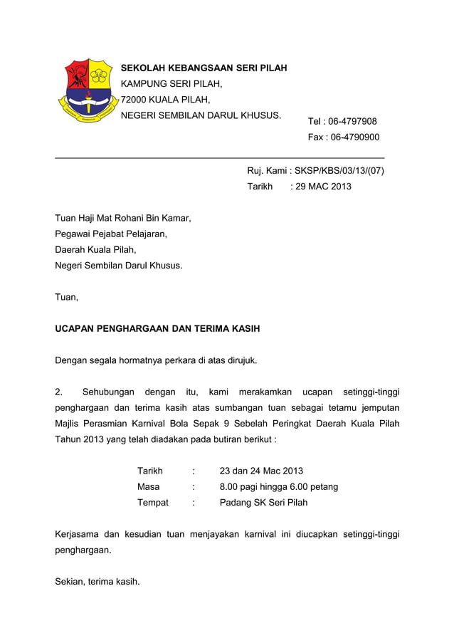 11 tujuan surat pekeliling perkhidmatan ini untuk memaklumkan keputusan. Di bawah ini anda akan dapati surat penghargaan sampel untuk menghantar atau e-mel kepada individu atau individu yang telah. Pihak yang dimaksud dan alamat lengkapnya.