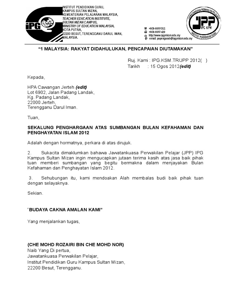 Surat penghargaan atas sumbangan surat terima kasih atas sumbangan.